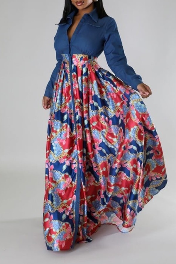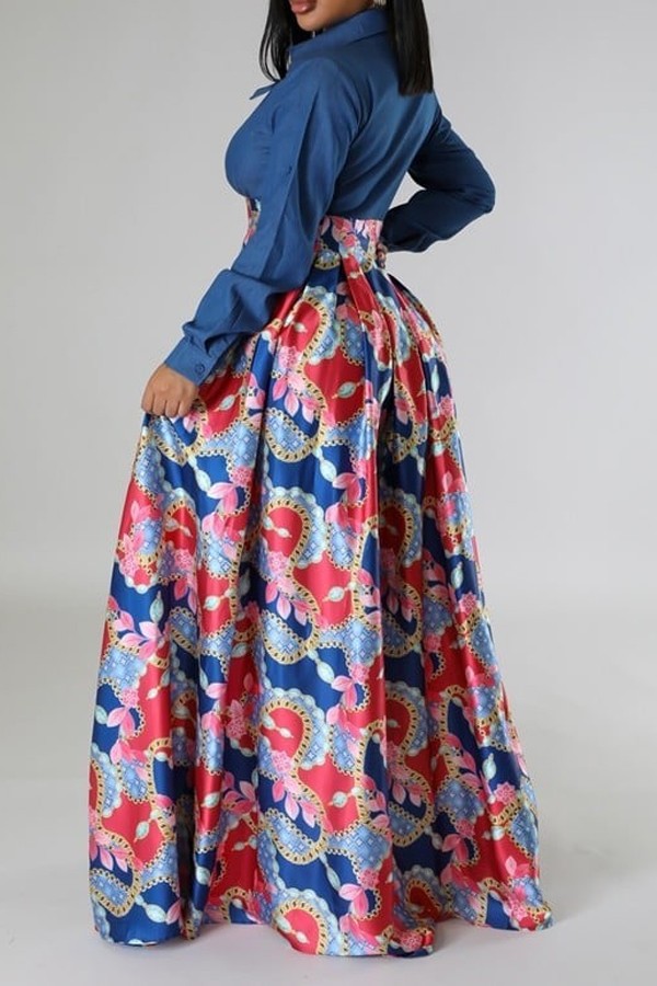 Stunning two-tone design with a solid navy top and a vibrant, multicolored patterned skirt