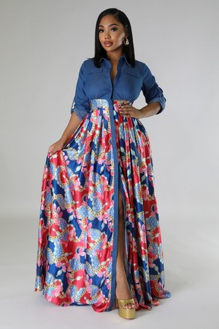 Bold, eye-catching chain and floral print on the skirt makes a statement